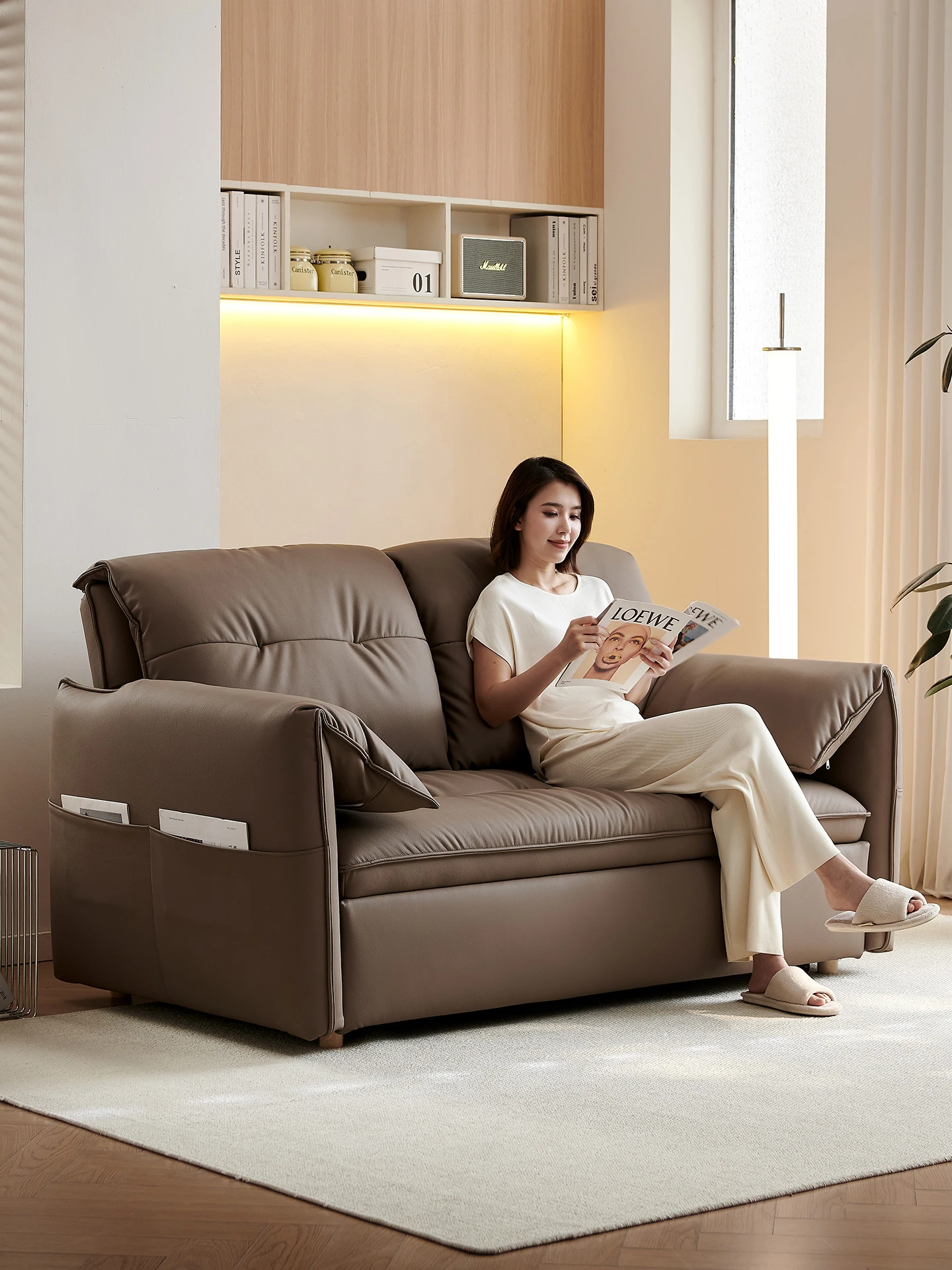 2025年新作!クリーミーウッド調ソファベッド - リビングにぴったりの多機能折りたたみ式新中式ソファ、1.2メートルのコンパクトサイズで、おしゃれで実用的な空間を演出!