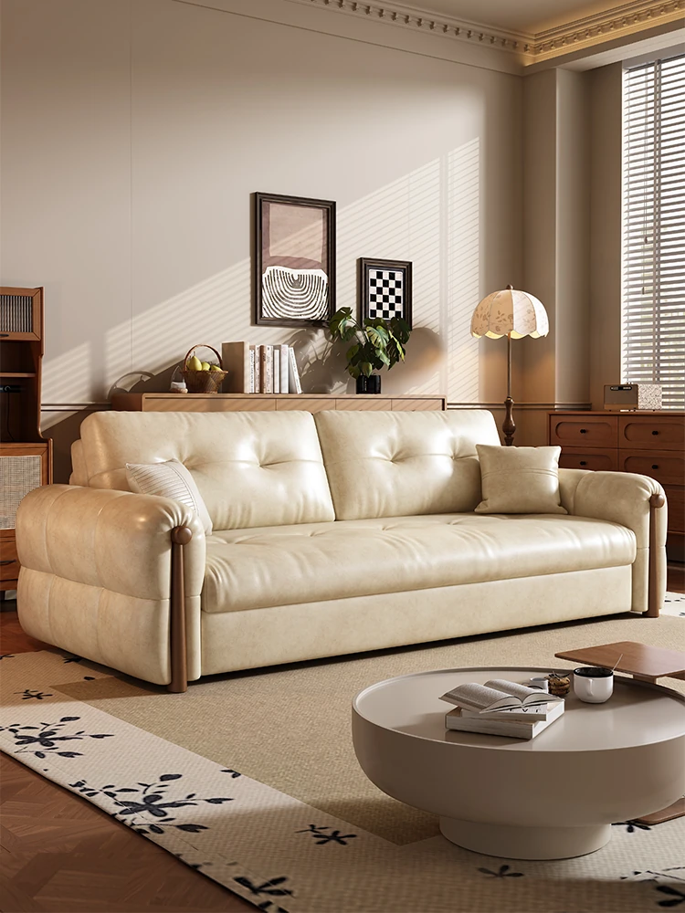 レトロ風クリームカラーのソファ - 折りたたみ可能な実木製2WAYデザイン、小型スペースに最適!2025年新作オイルワックスレザーソファベッドで、スタイリッシュなインテリアを実現!