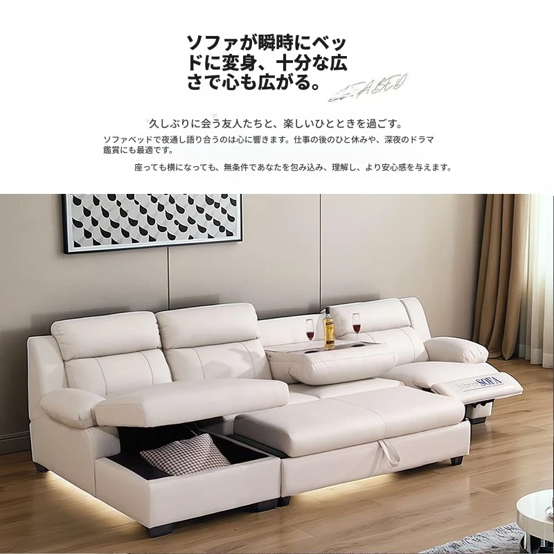 電動多機能ソファ|壁にぴったりの小型スペース向け!宇宙船デザインの本革製、フラットに伸びるデイベッドタイプ。貴婦人スタイルで収納も完備!快適な空間を演出する理想的なソファベッドです。