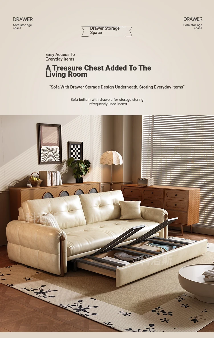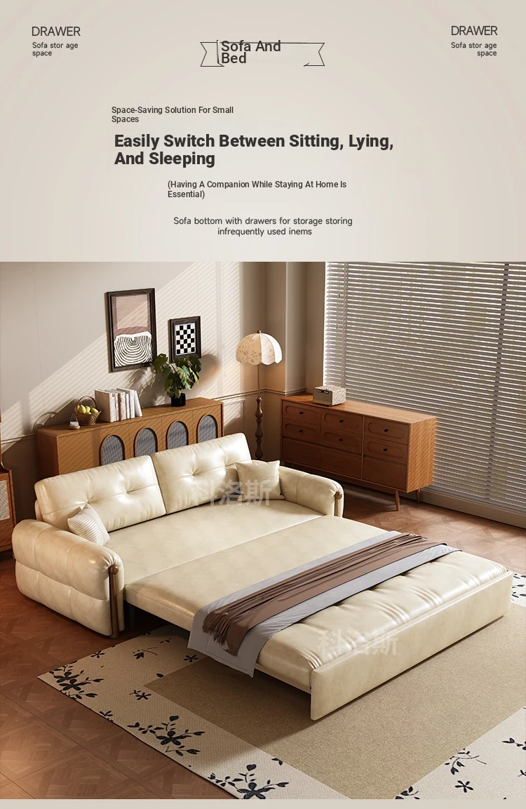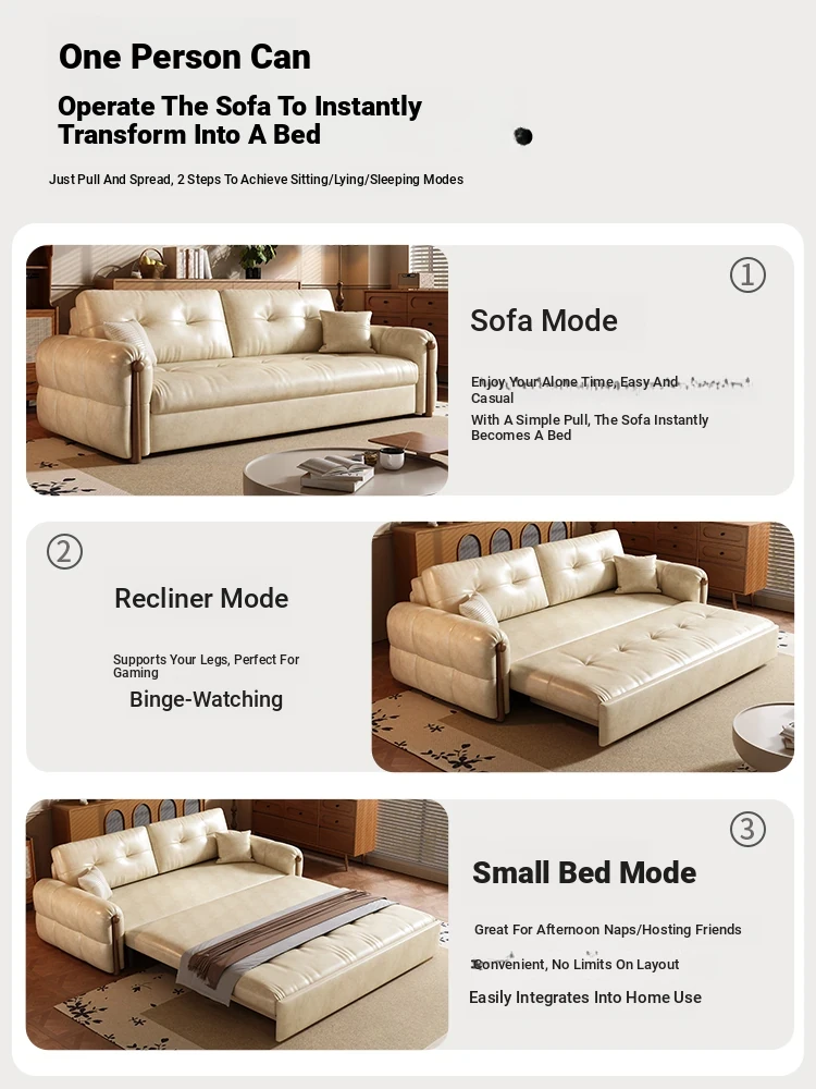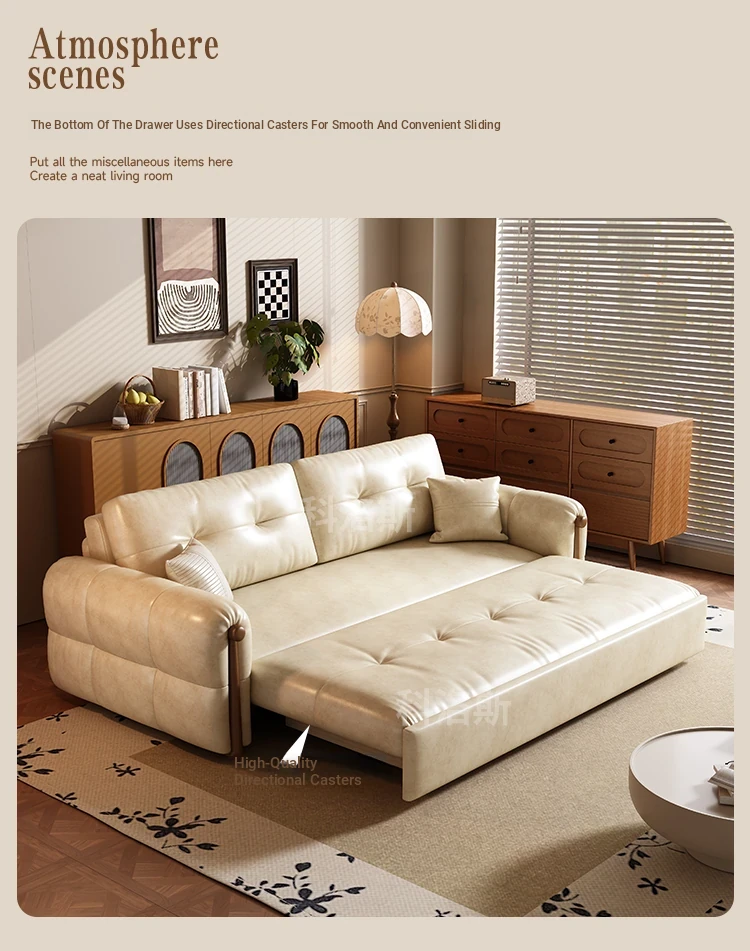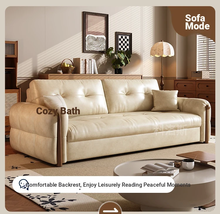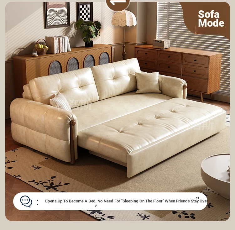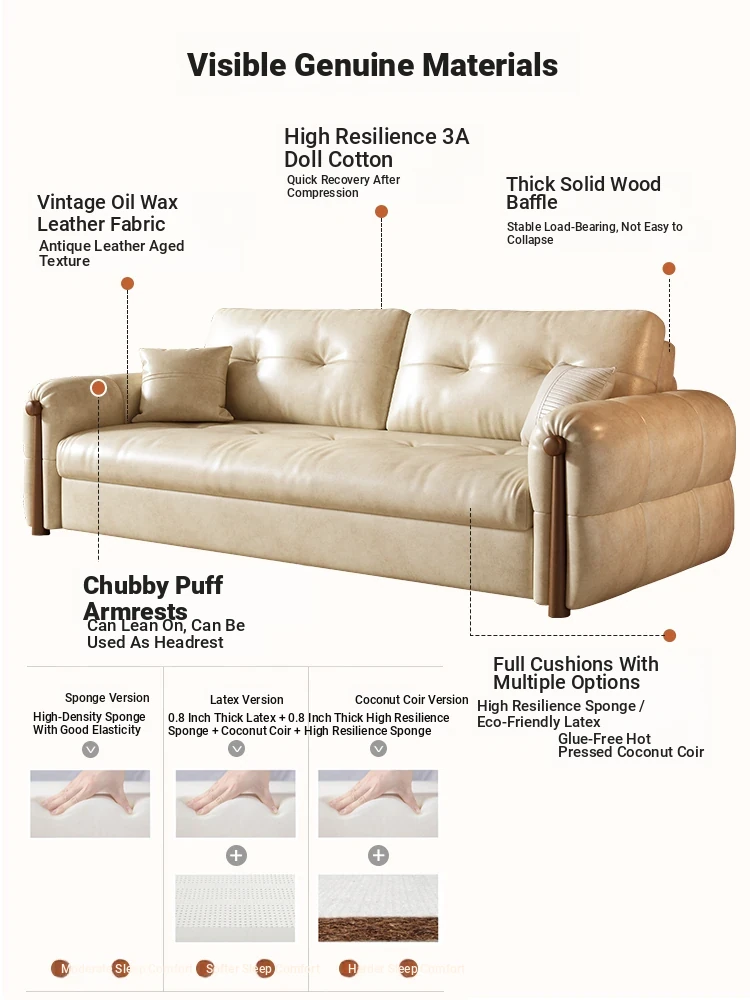 Vintage Cream Sofa - Foldable Solid Wood Dual-Use Retro Design for Small Spaces, 2025 New Waxed Leather Sofa Bed