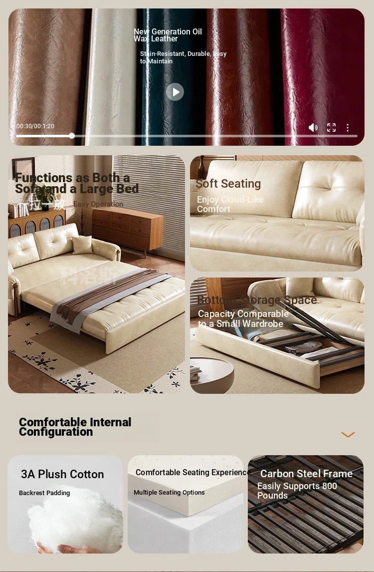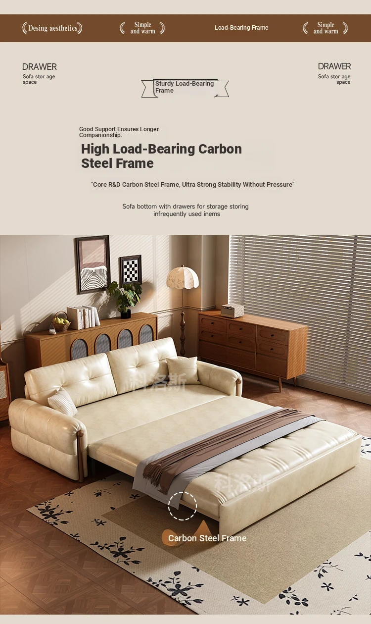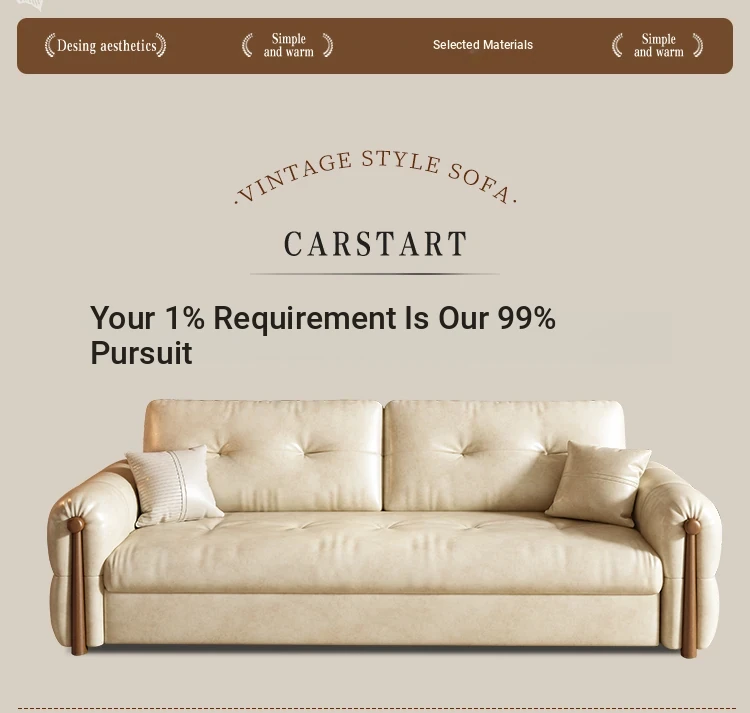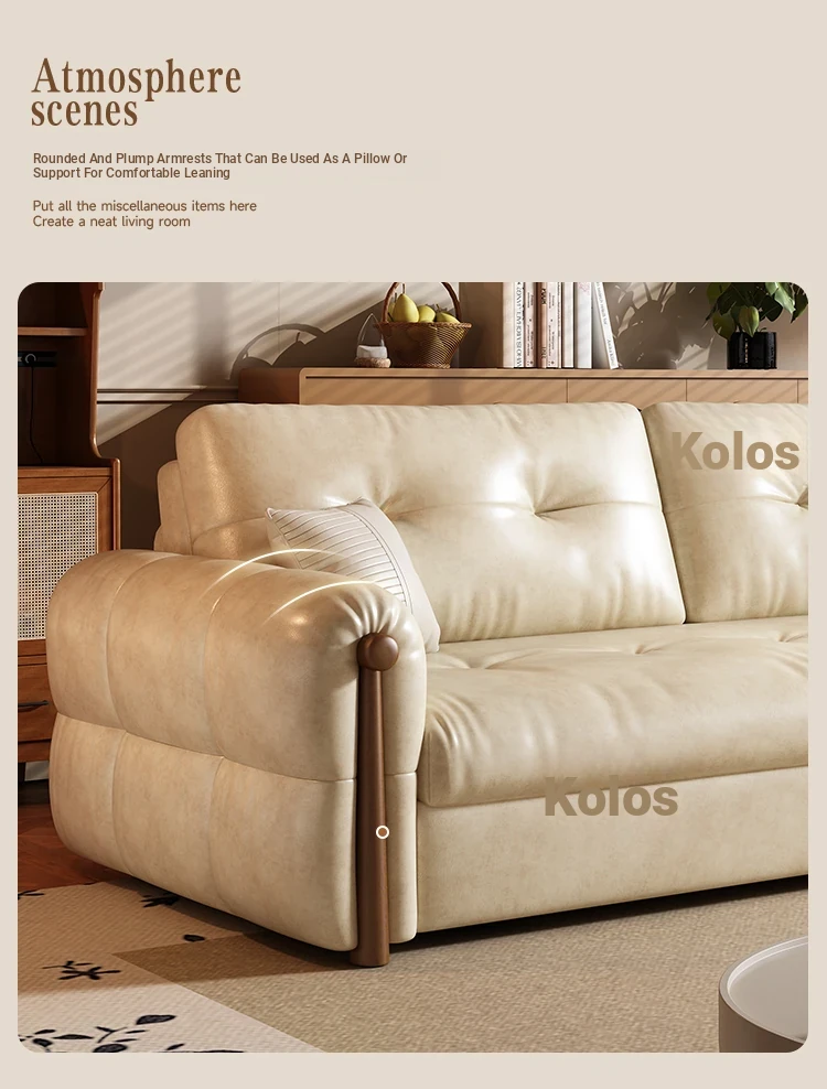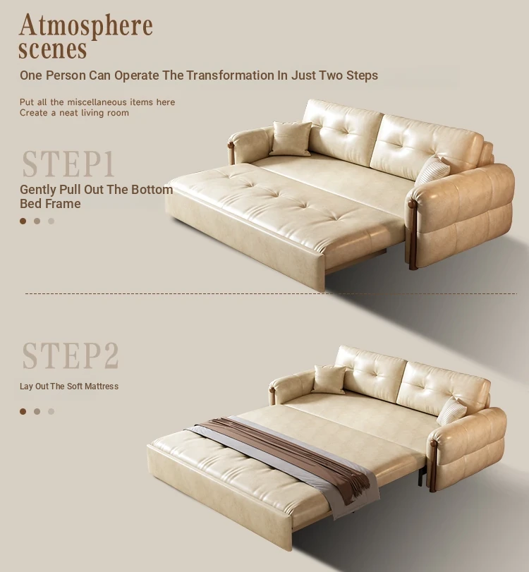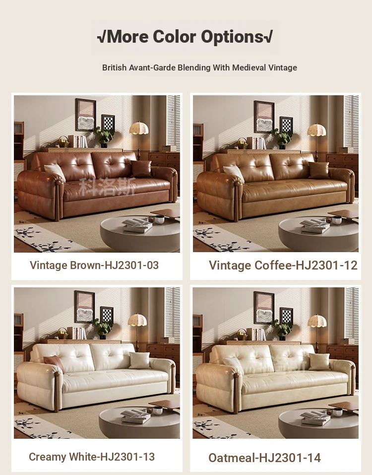Vintage Cream Sofa - Foldable Solid Wood Dual-Use Retro Design for Small Spaces, 2025 New Waxed Leather Sofa Bed