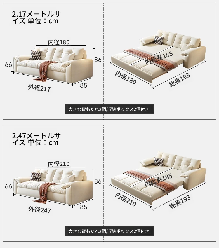 (適度な硬さ)2.17mソファベッド【粉なしスポンジタイプ+収納ボックス】