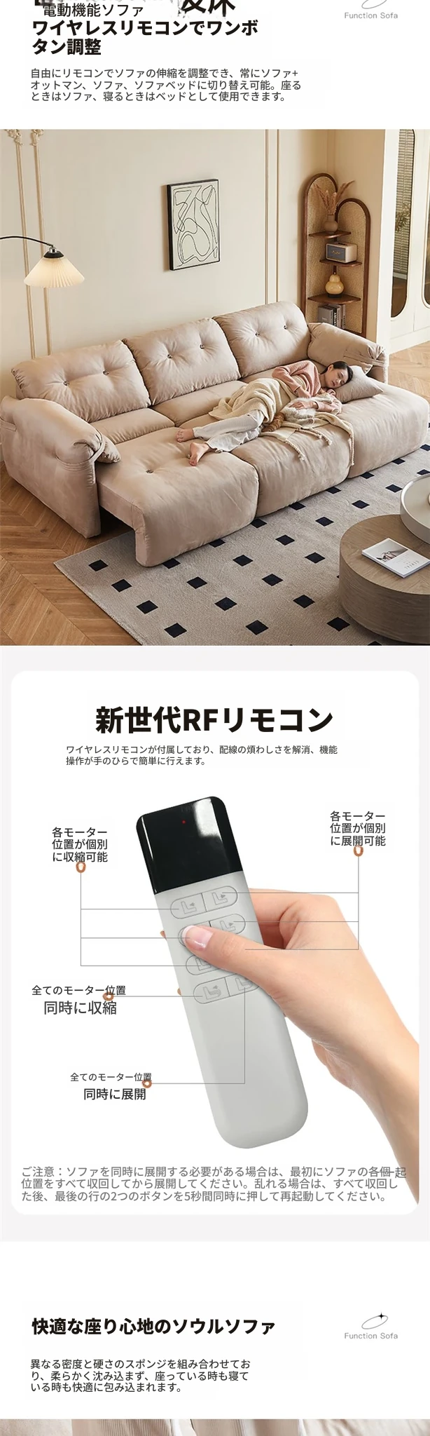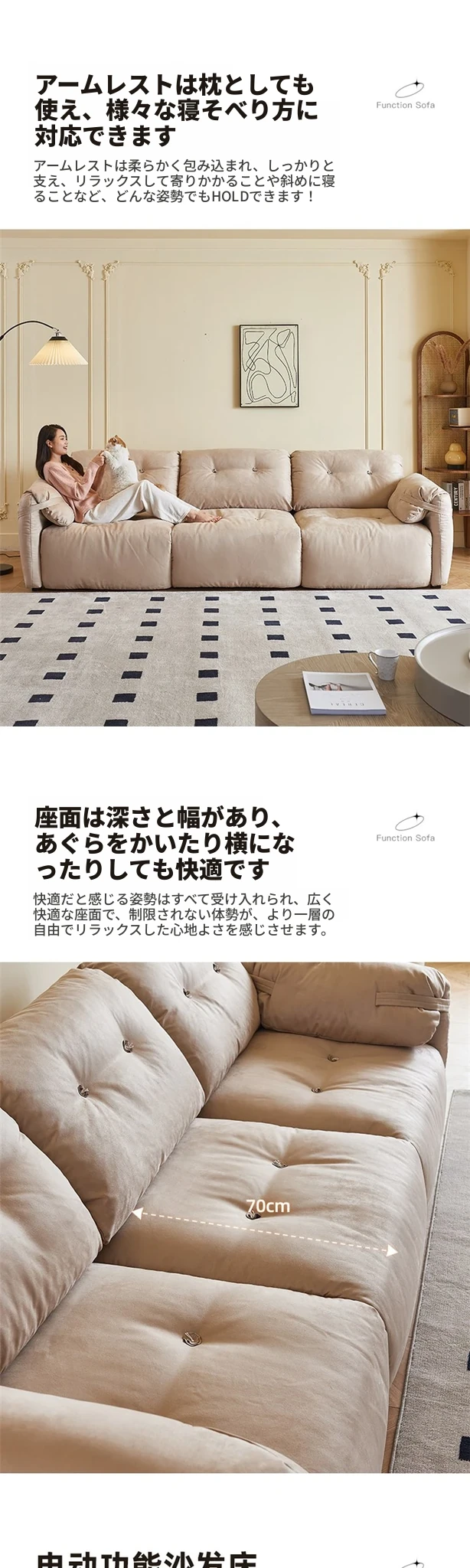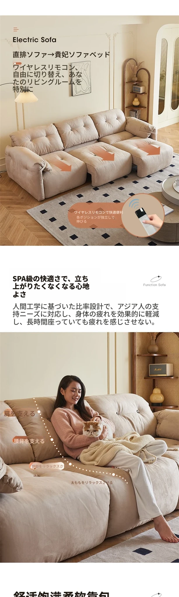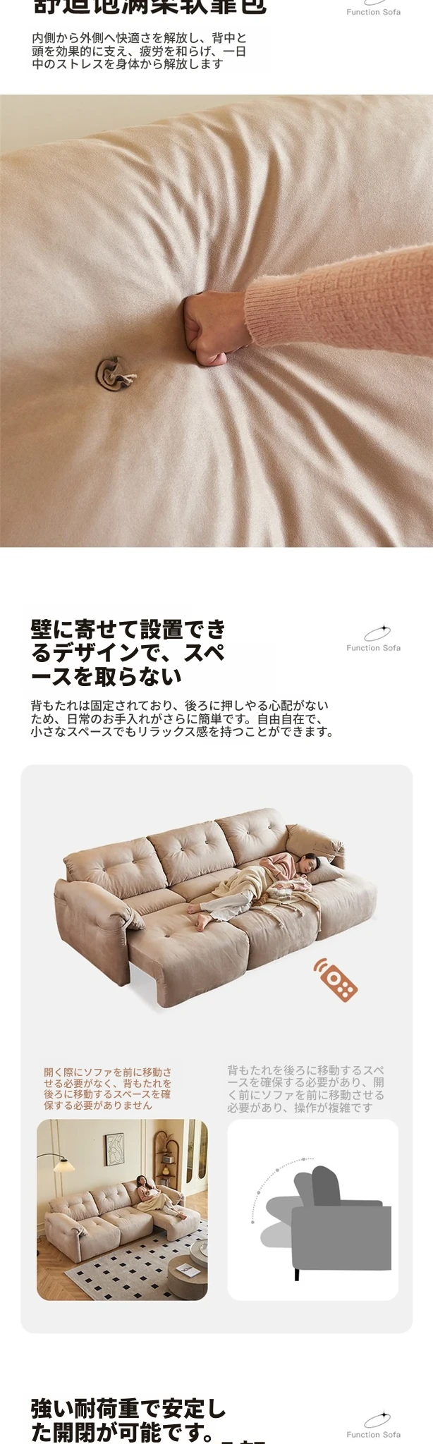 モダンでシンプルなデザインの雲のような機能性電動ソファベッド、コンパクトなサイズでリビングにぴったり!伸縮可能なヘッドレスト、まるで宇宙船のような快適さを実現した布製ソファ。
