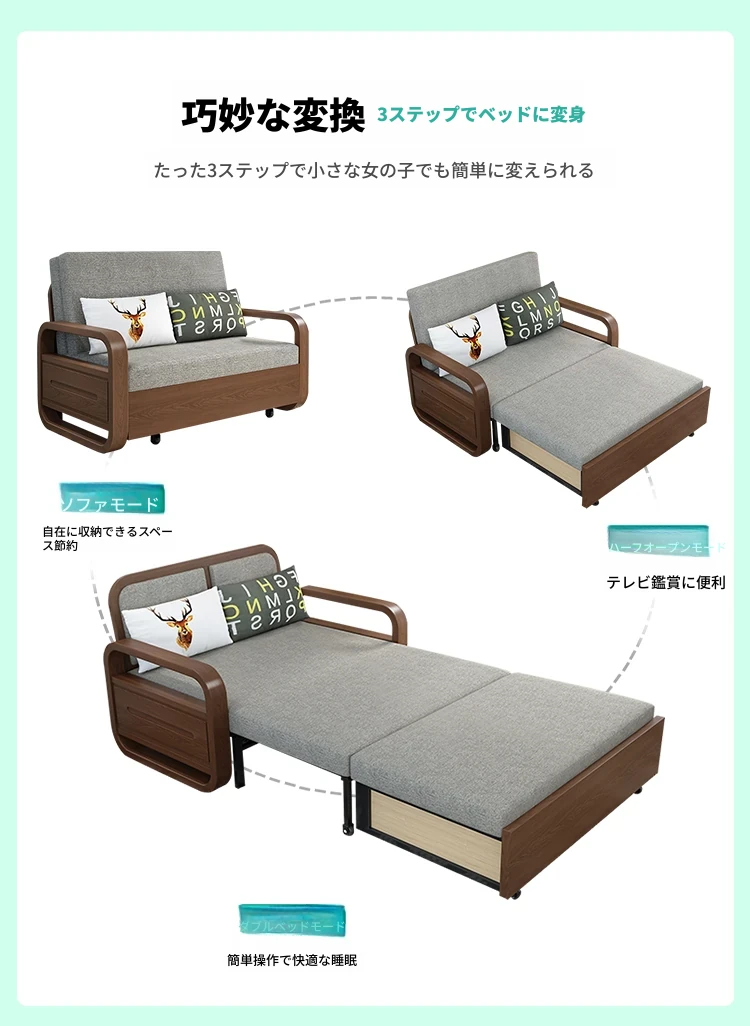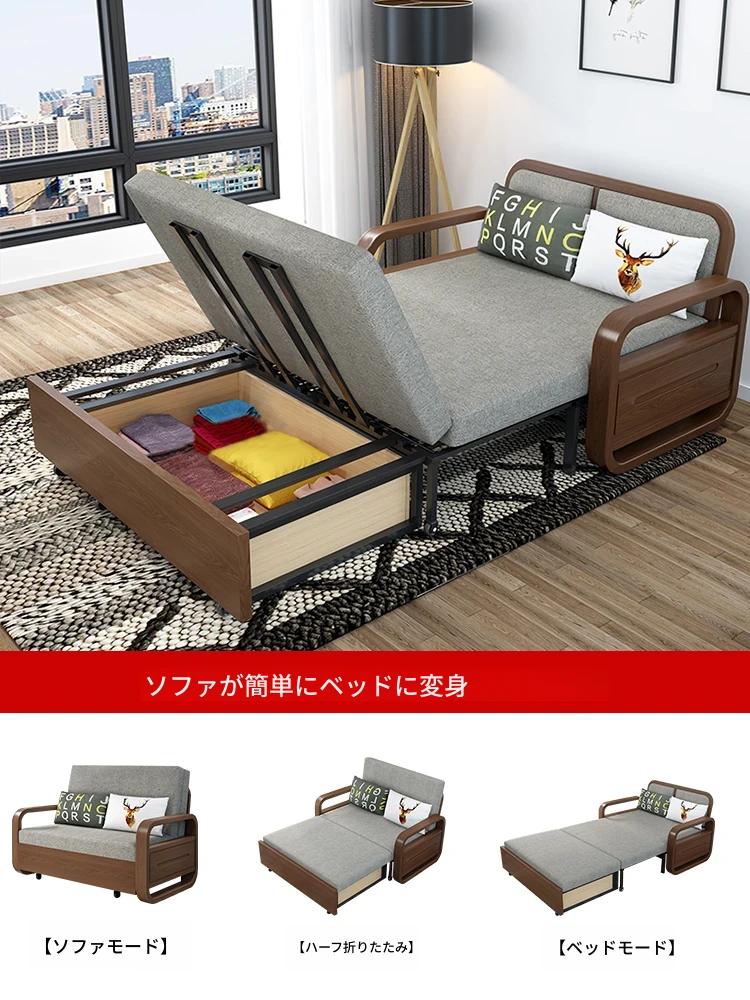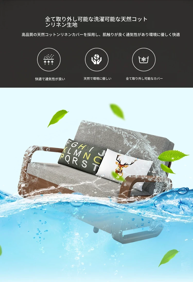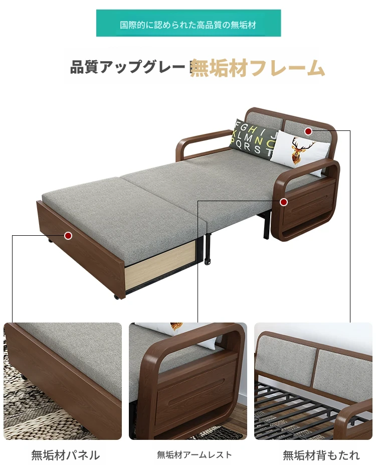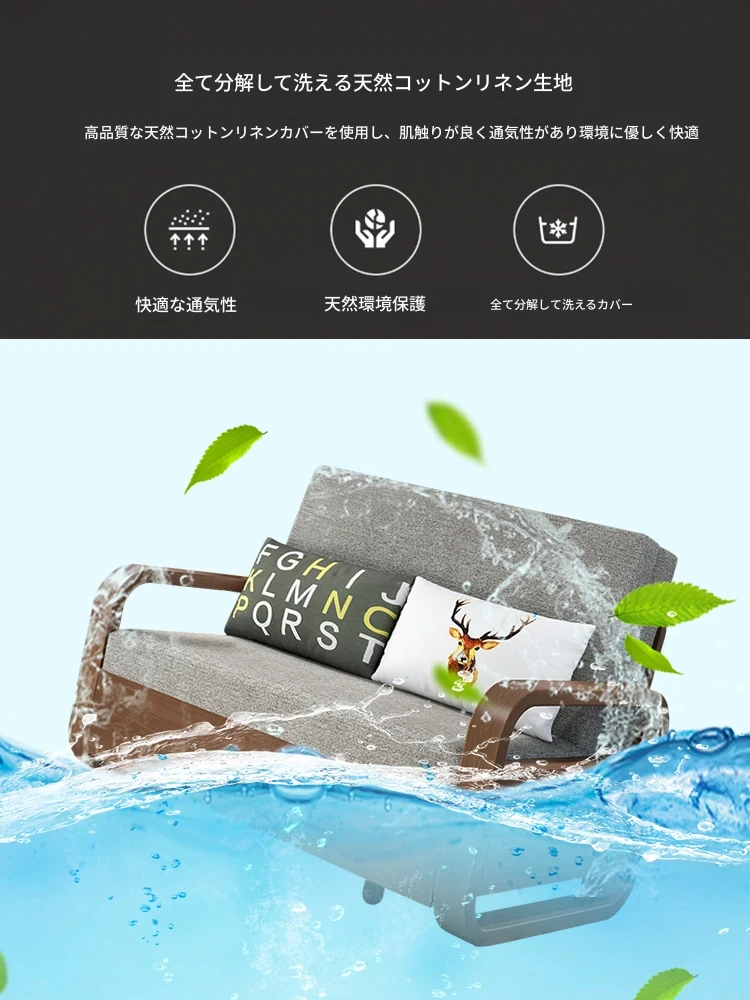 一人用実木ソファベッド|2WAY機能付き、折りたたみ式のコットンリネンソファ|小スペースに最適な書斎やバルコニー用伸縮ベッド!快適さと機能性を兼ね備えた一品。