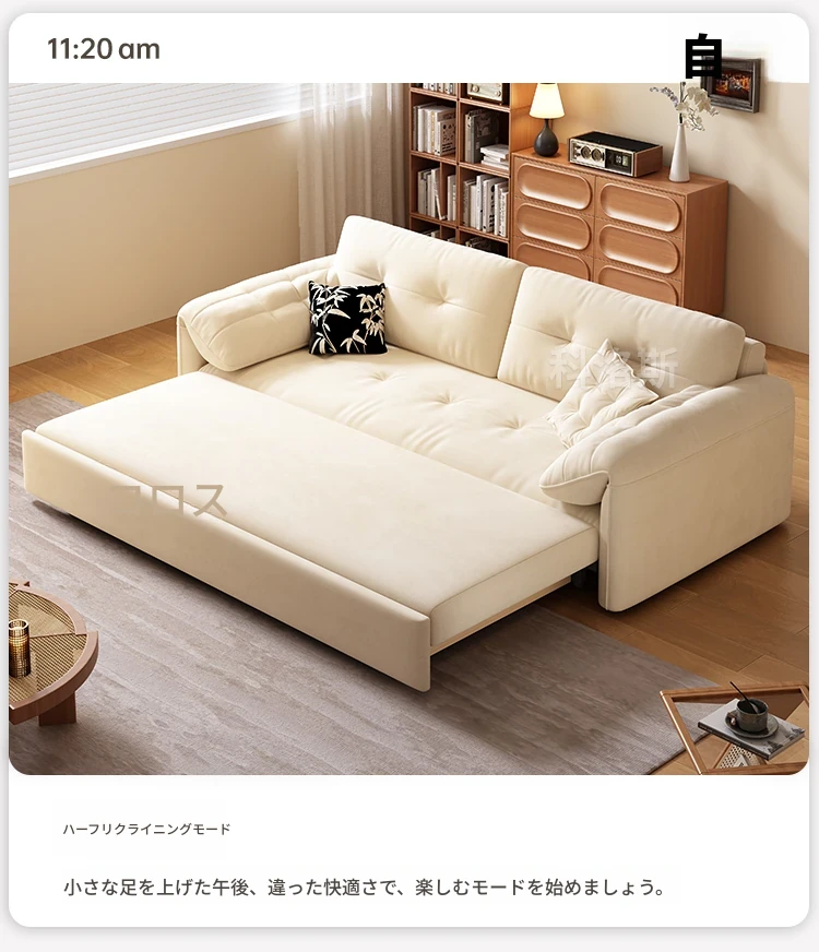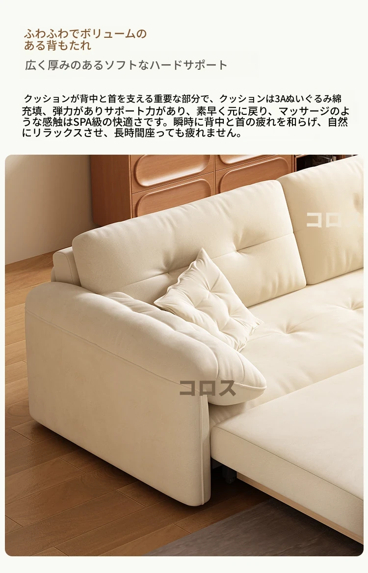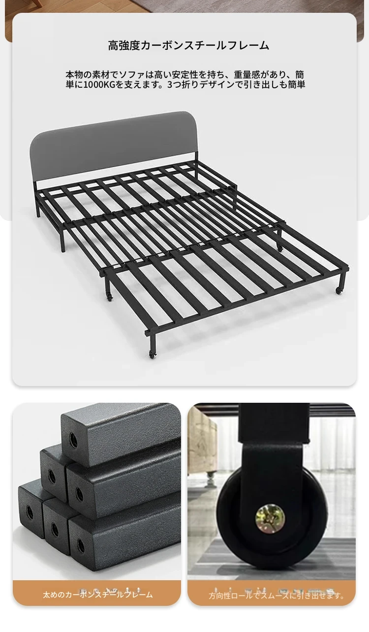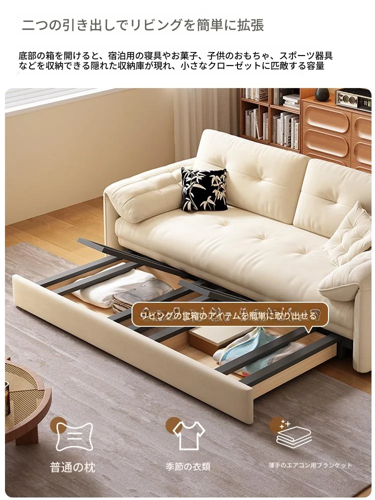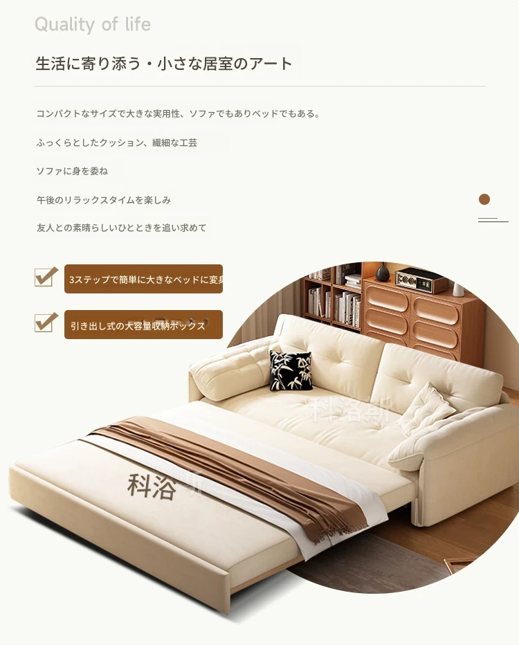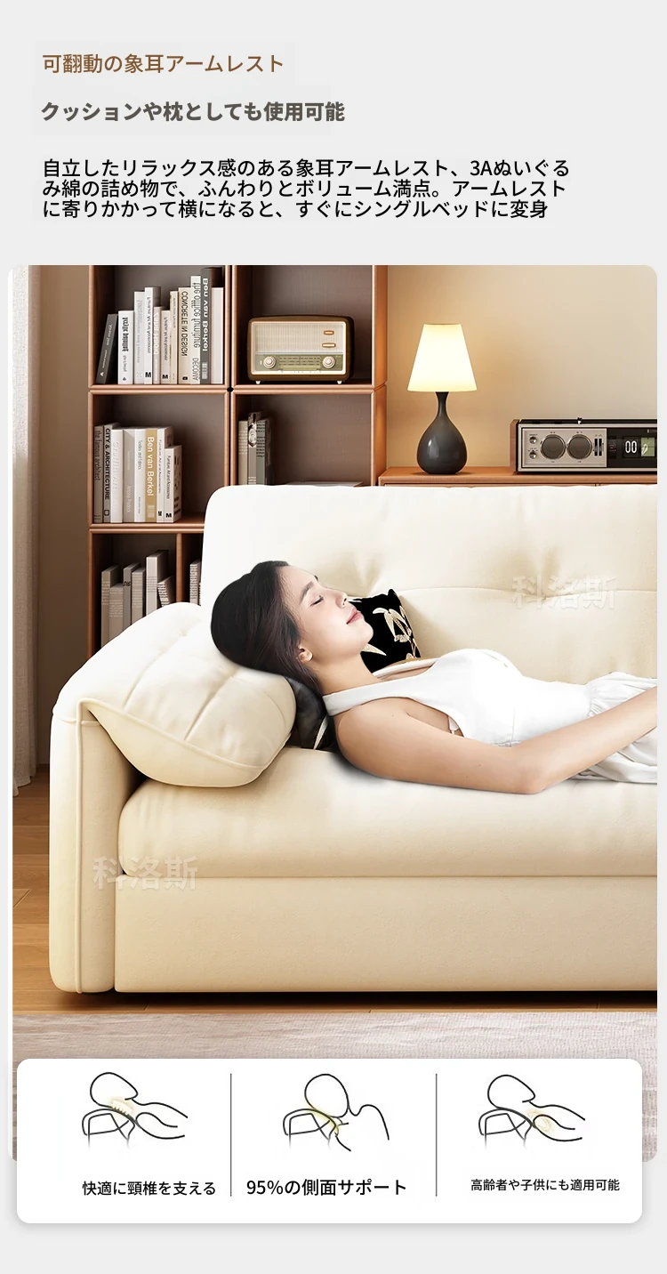 天然木材使用のクリーム風ソファベッド、エレファントイヤーデザイン!人気の折りたたみ式・多機能タイプ、小型スペースにもぴったり、伸縮可能で収納も充実。おしゃれな空間を演出します!
