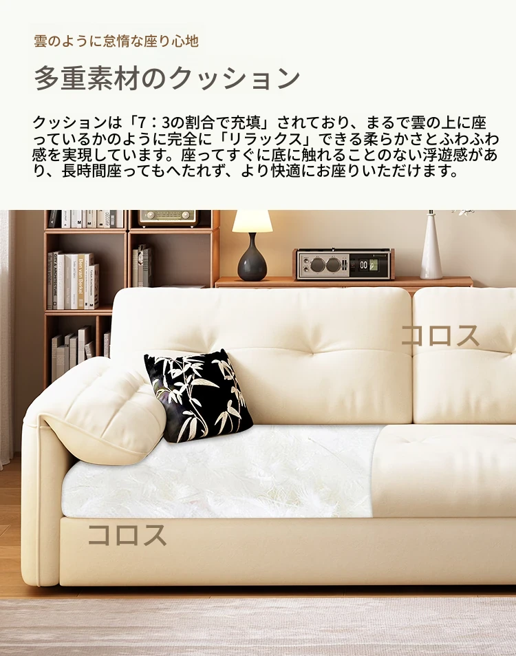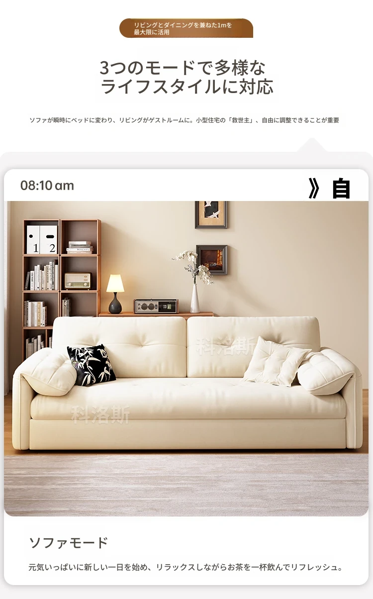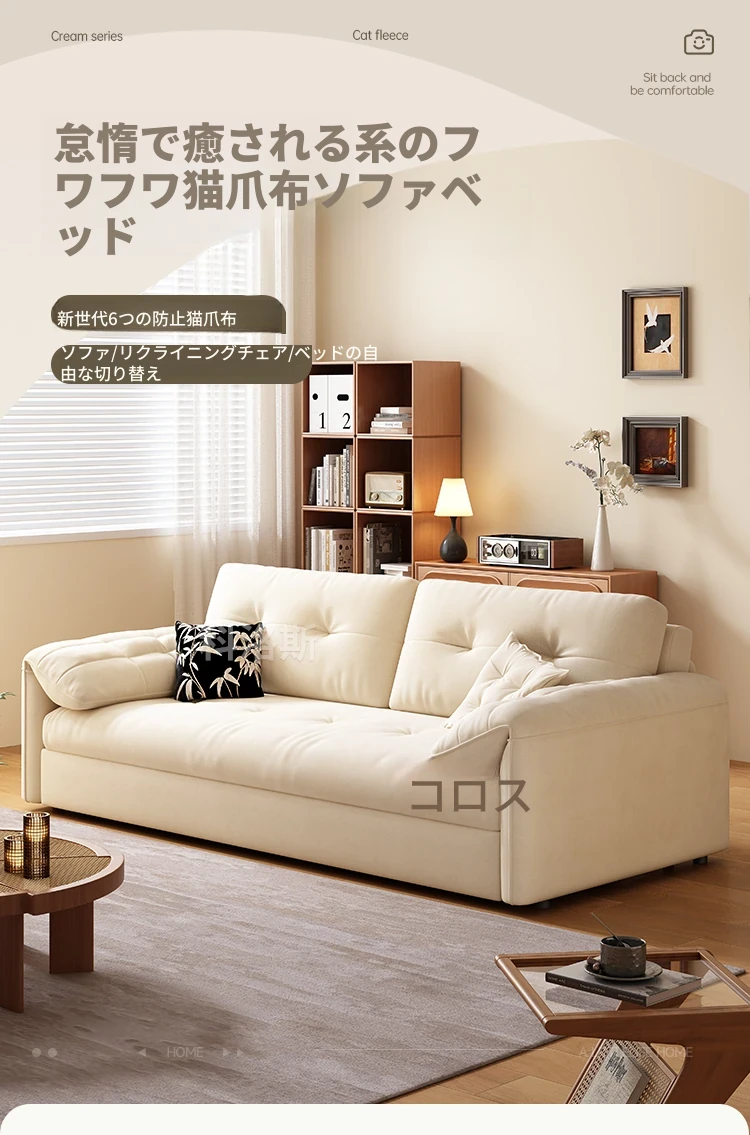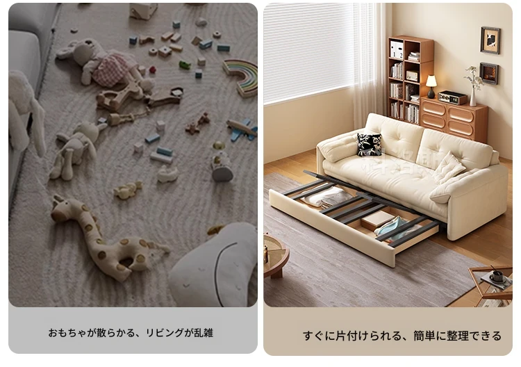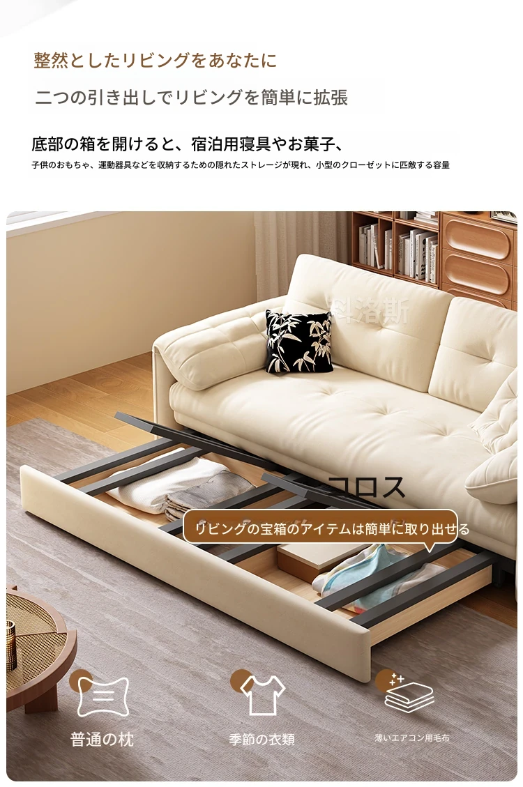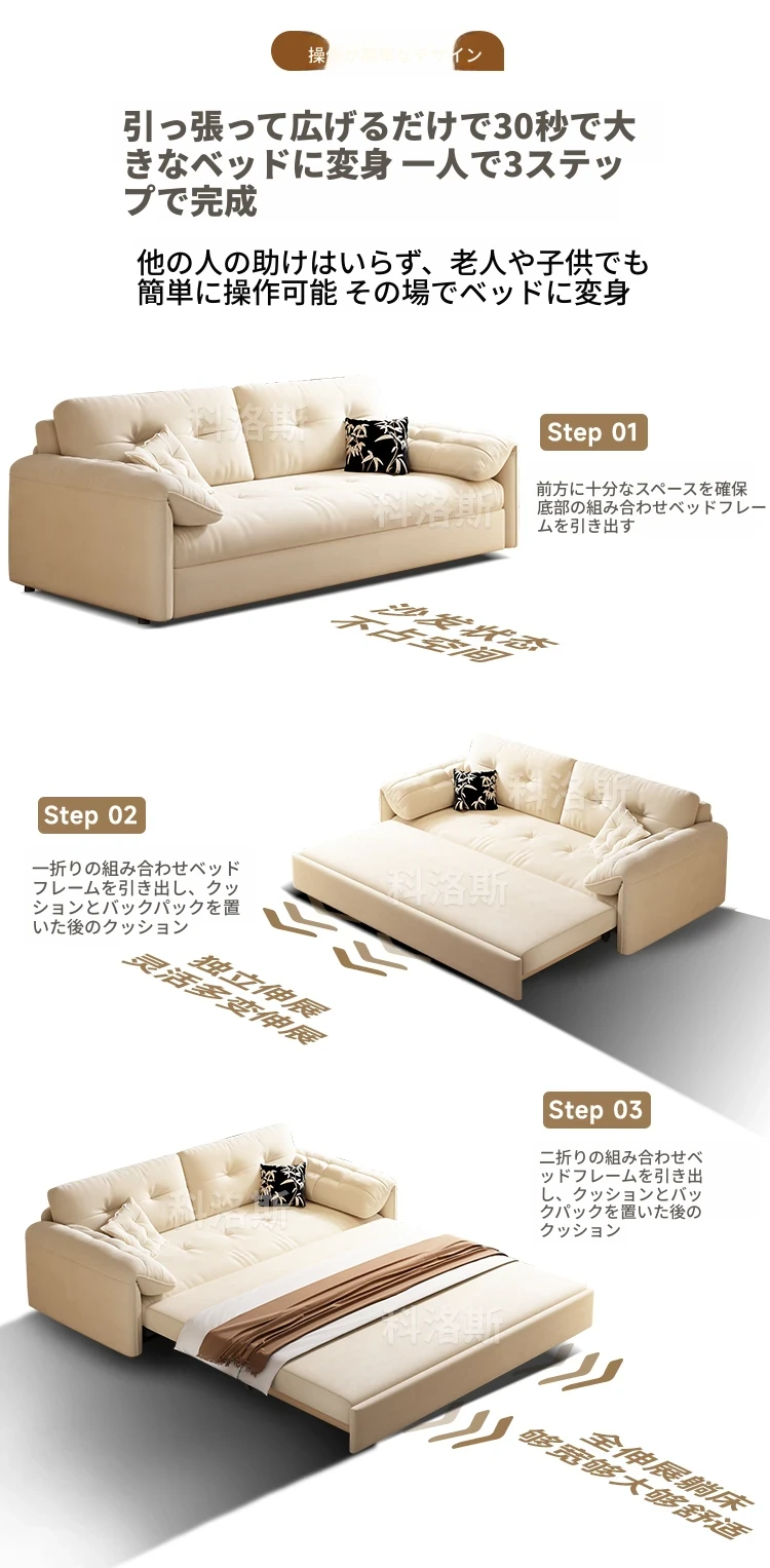 天然木材使用のクリーム風ソファベッド、エレファントイヤーデザイン!人気の折りたたみ式・多機能タイプ、小型スペースにもぴったり、伸縮可能で収納も充実。おしゃれな空間を演出します!