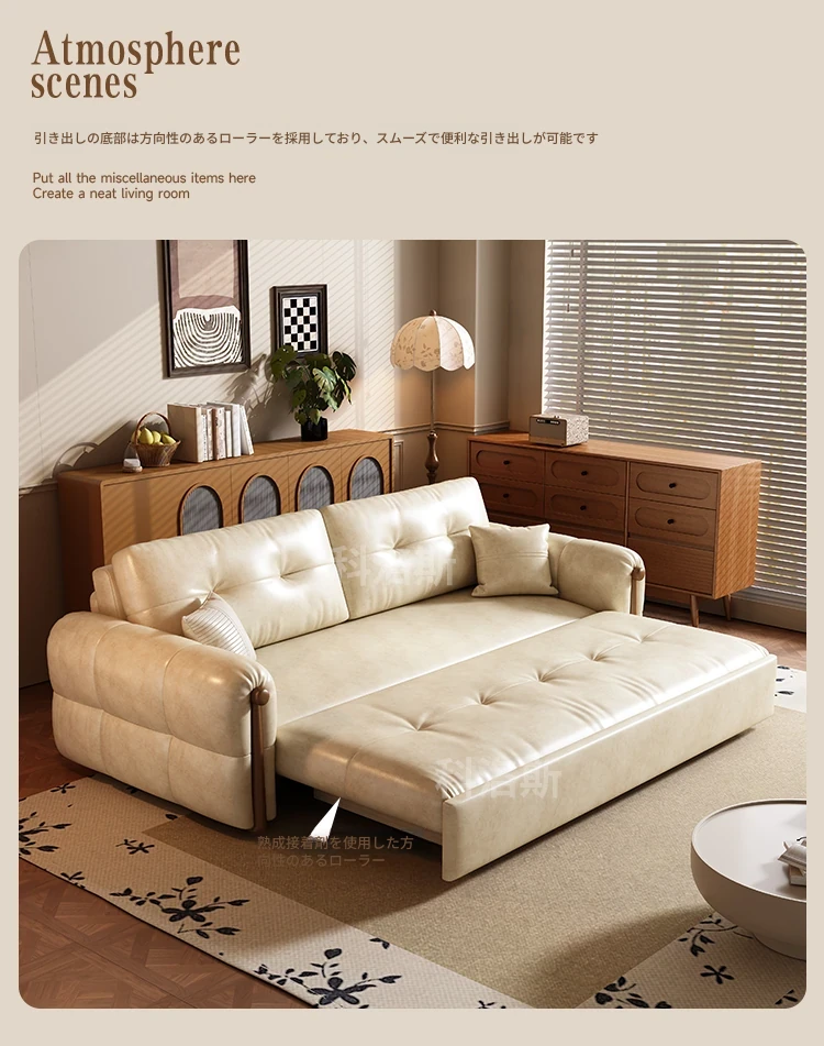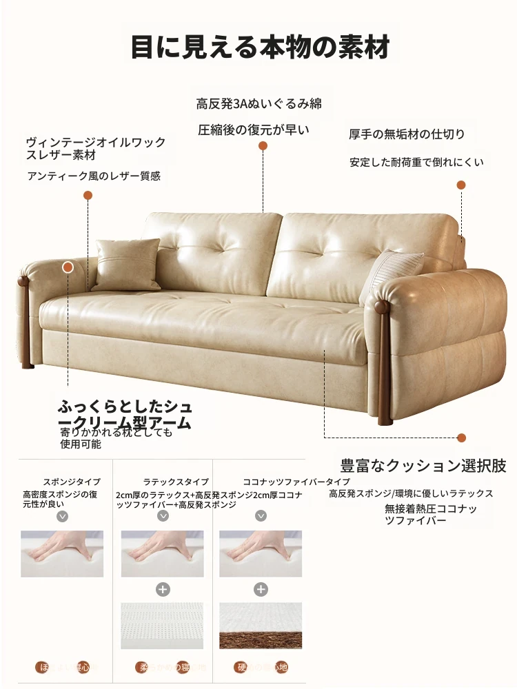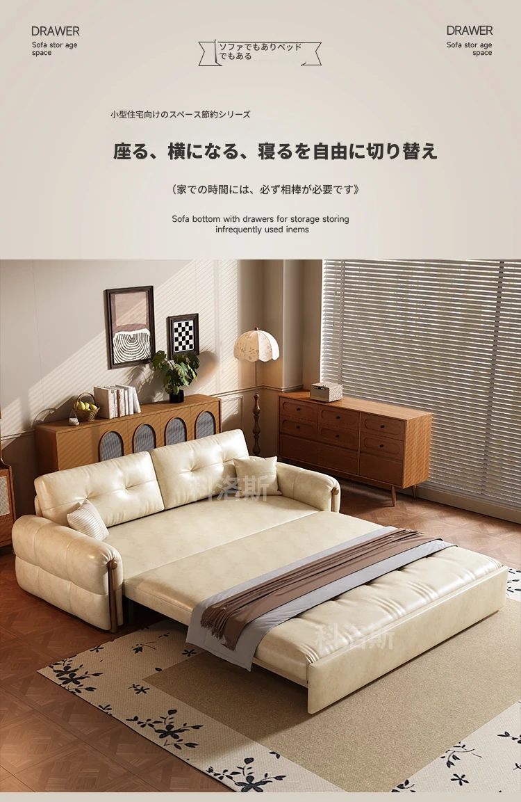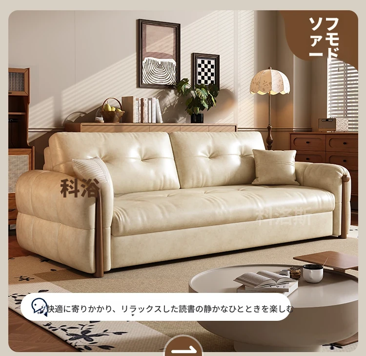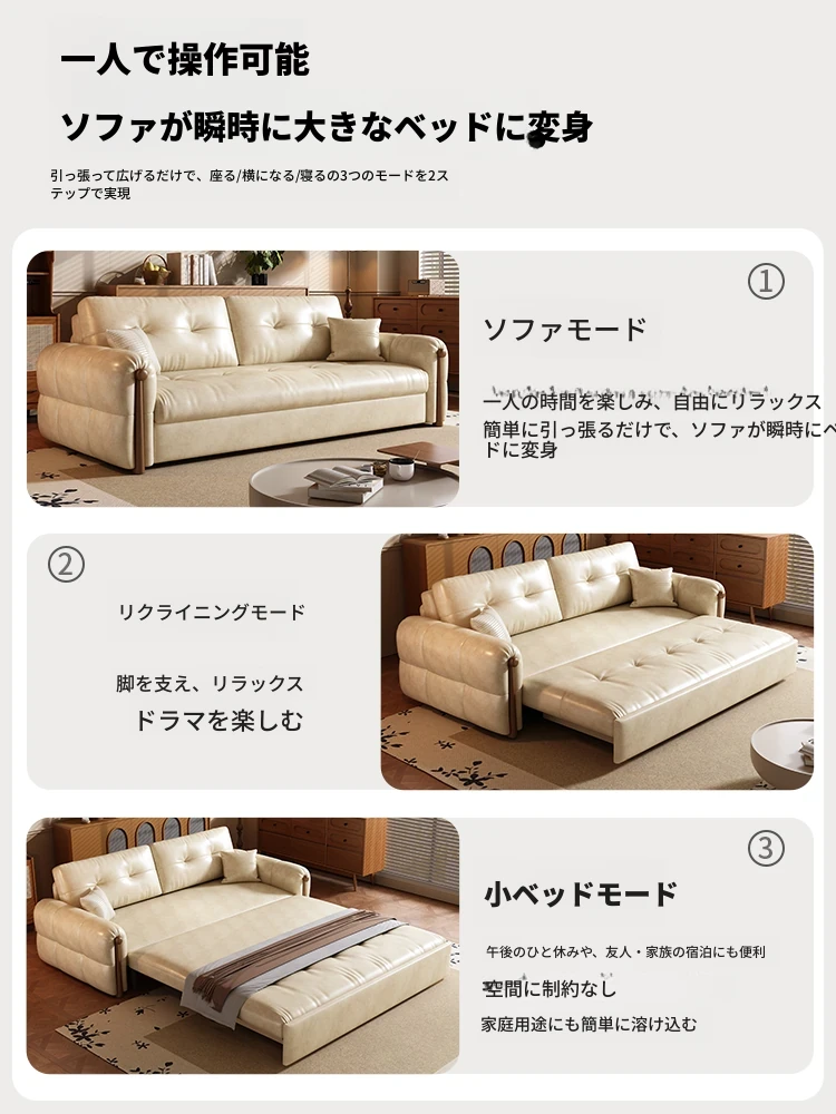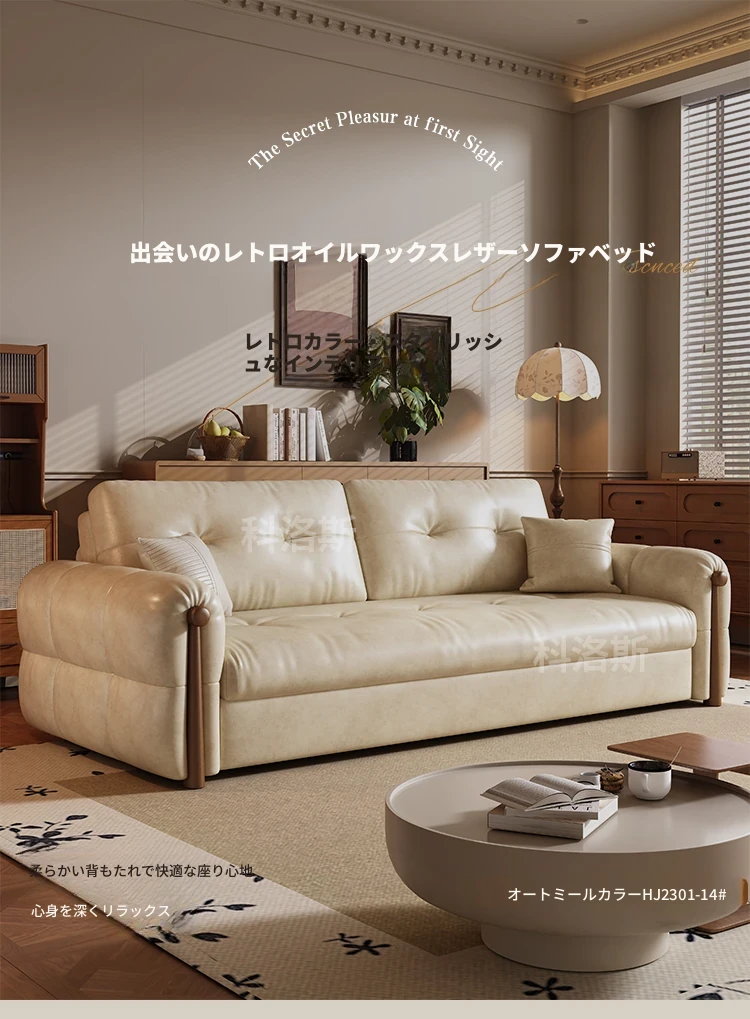 レトロ風クリームカラーのソファ - 折りたたみ可能な実木製2WAYデザイン、小型スペースに最適!2025年新作オイルワックスレザーソファベッドで、スタイリッシュなインテリアを実現!