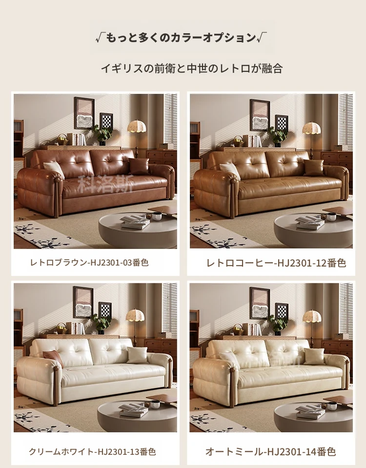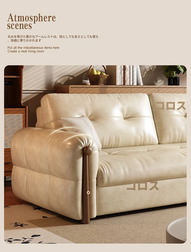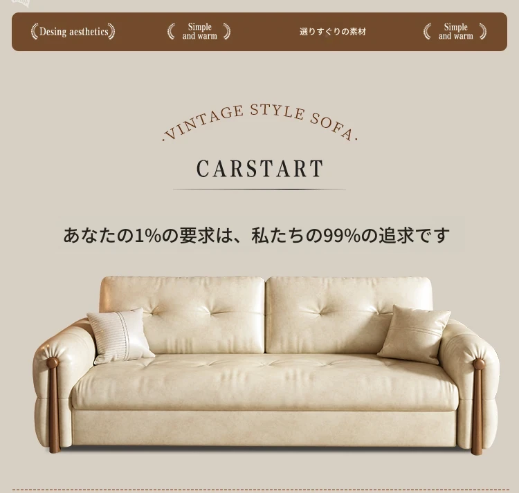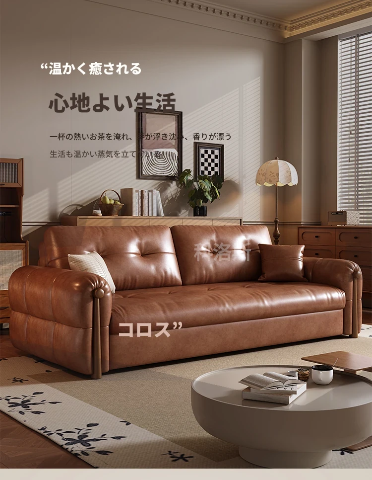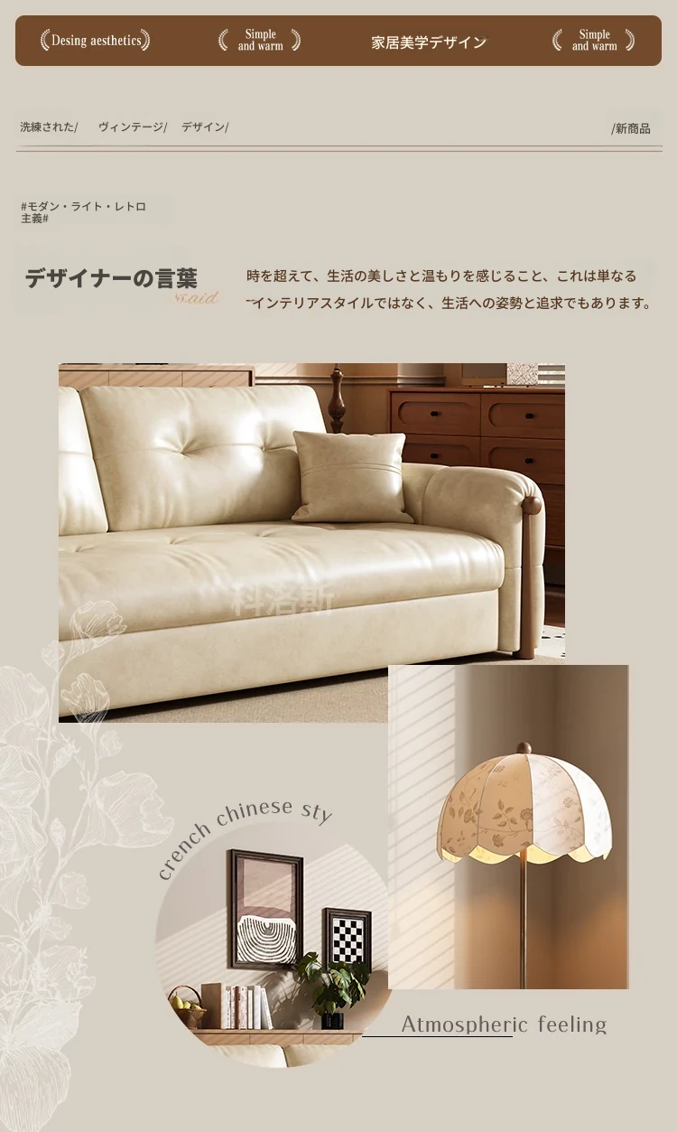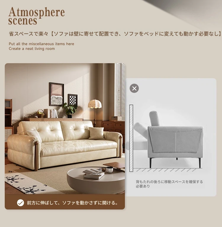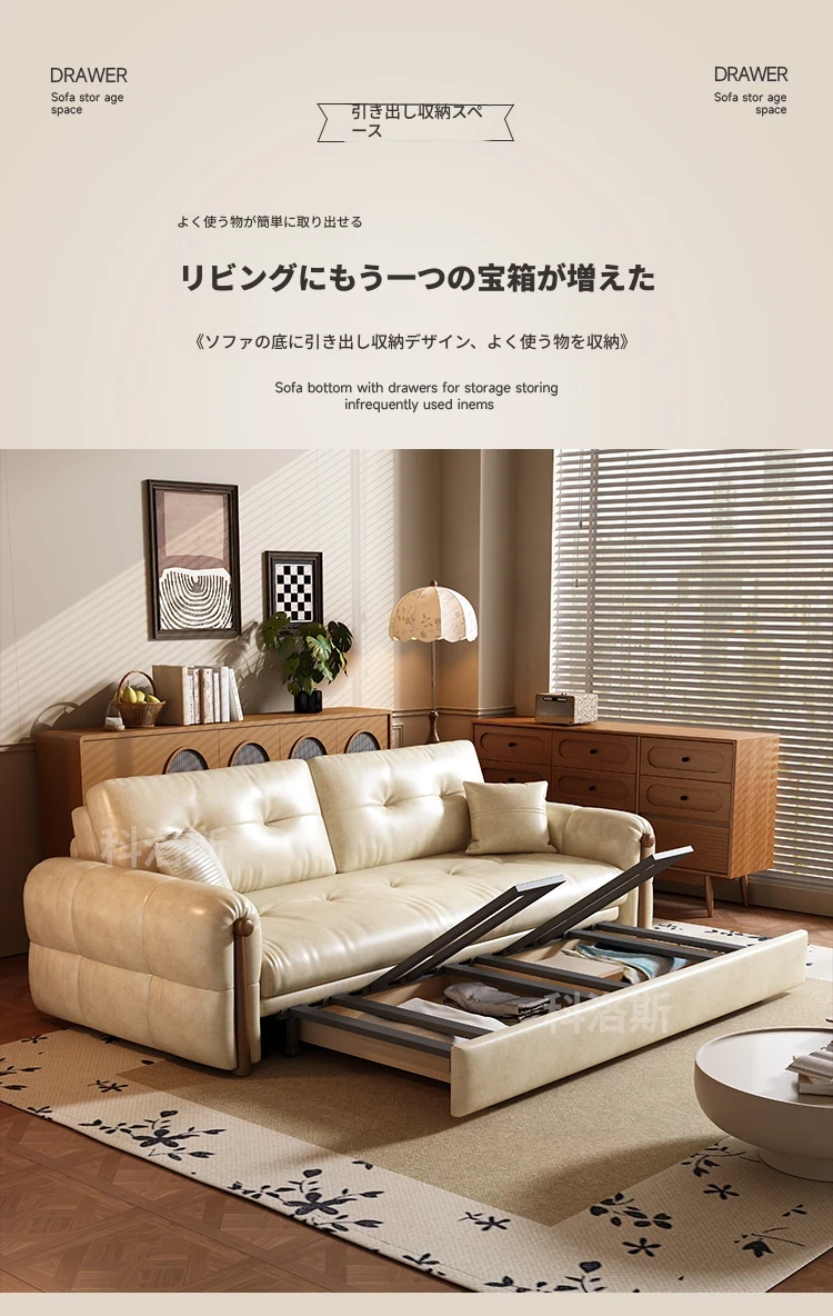 レトロ風クリームカラーのソファ - 折りたたみ可能な実木製2WAYデザイン、小型スペースに最適!2025年新作オイルワックスレザーソファベッドで、スタイリッシュなインテリアを実現!