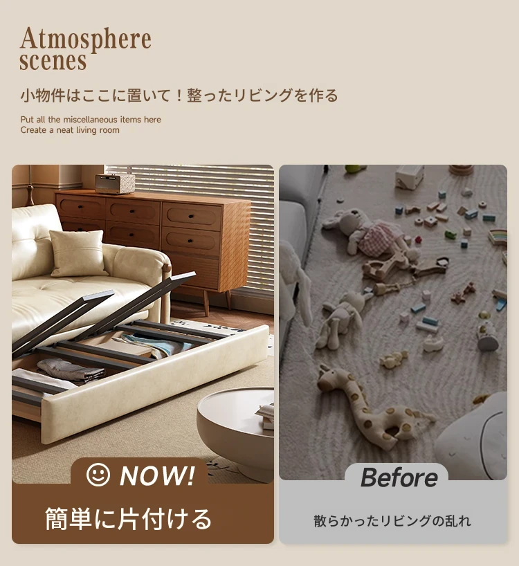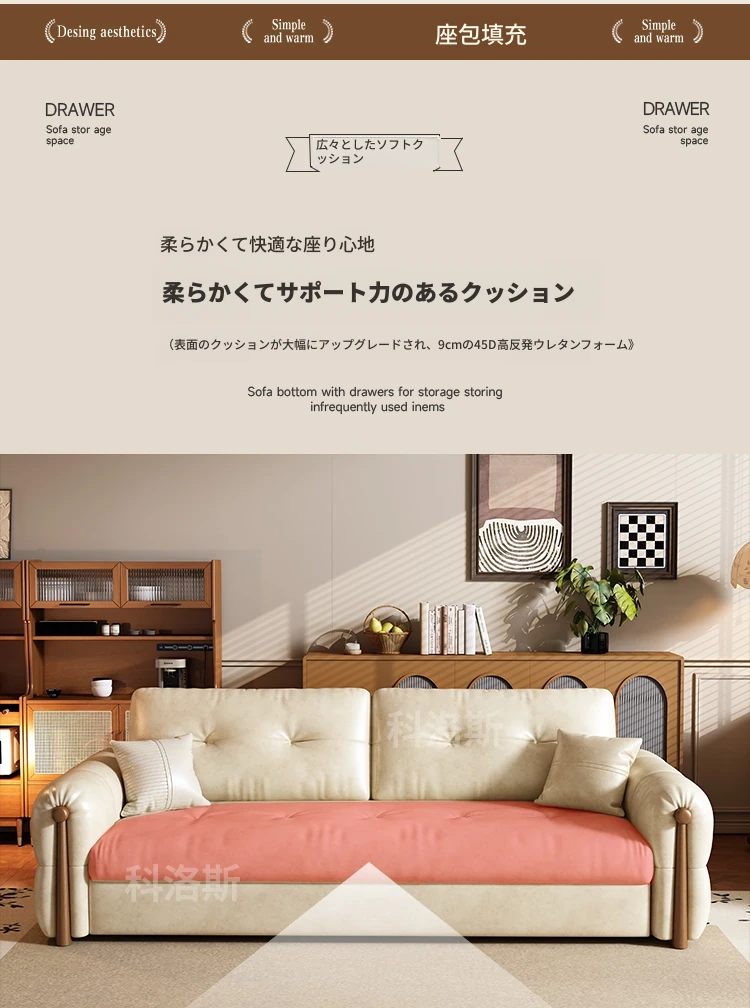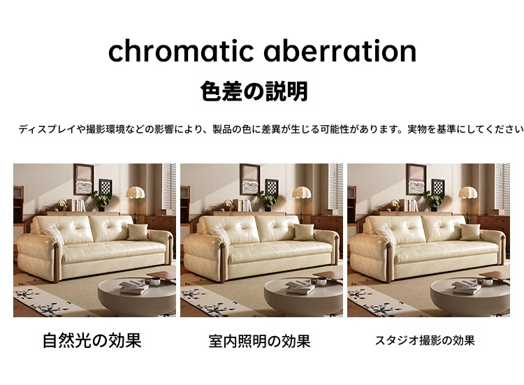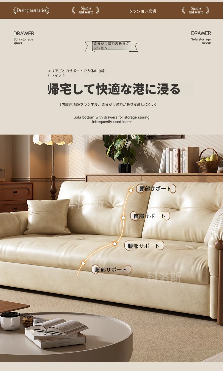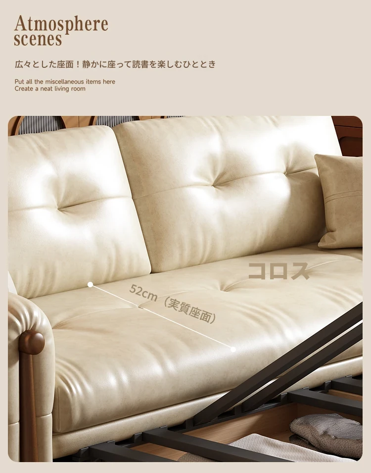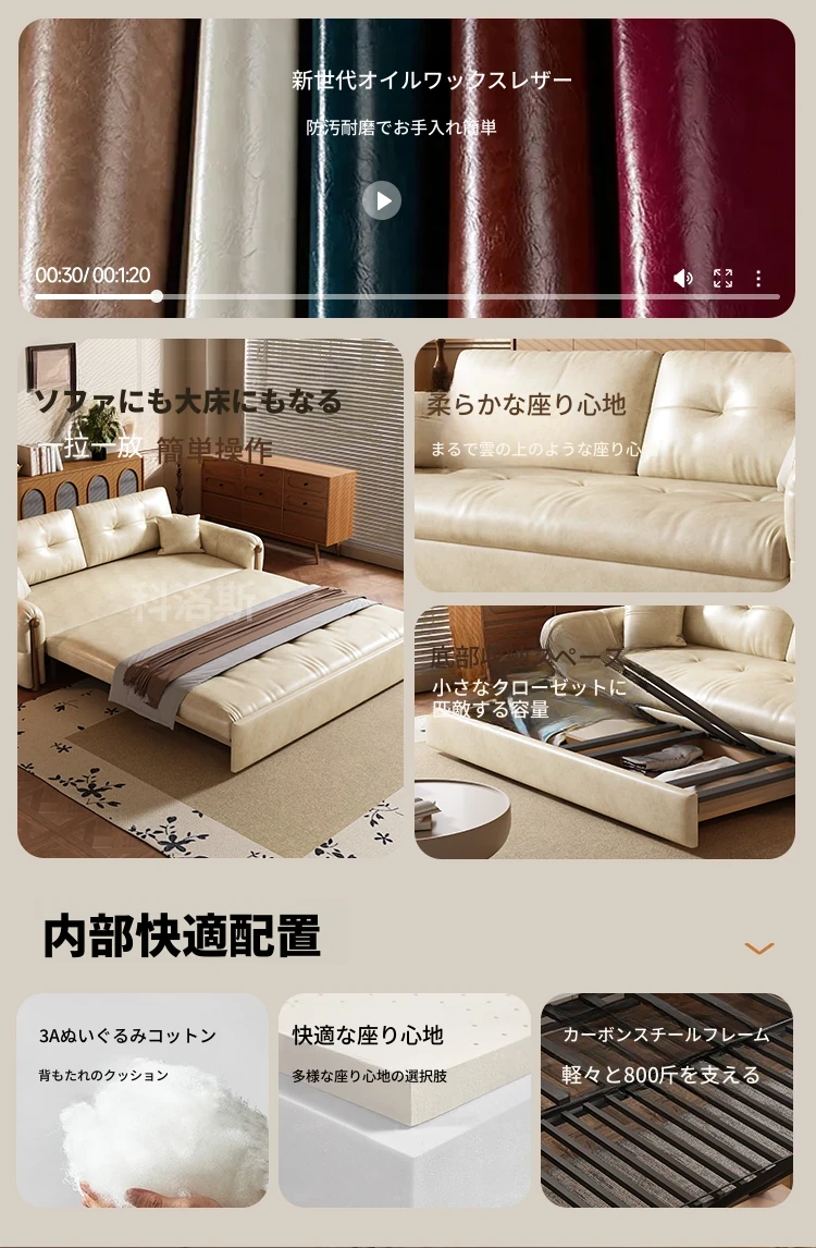 レトロ風クリームカラーのソファ - 折りたたみ可能な実木製2WAYデザイン、小型スペースに最適!2025年新作オイルワックスレザーソファベッドで、スタイリッシュなインテリアを実現!