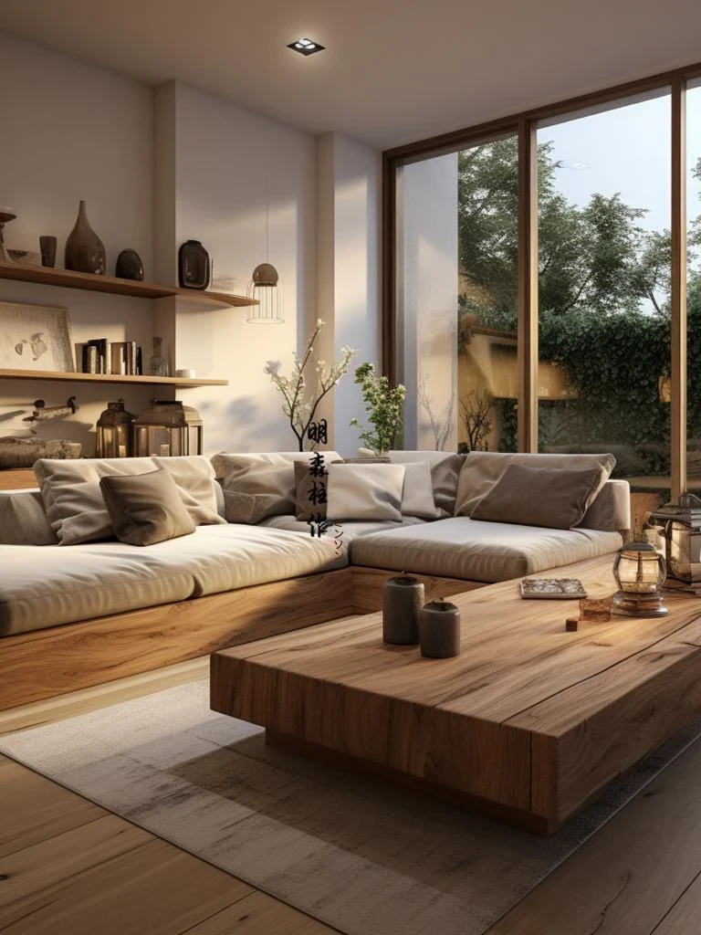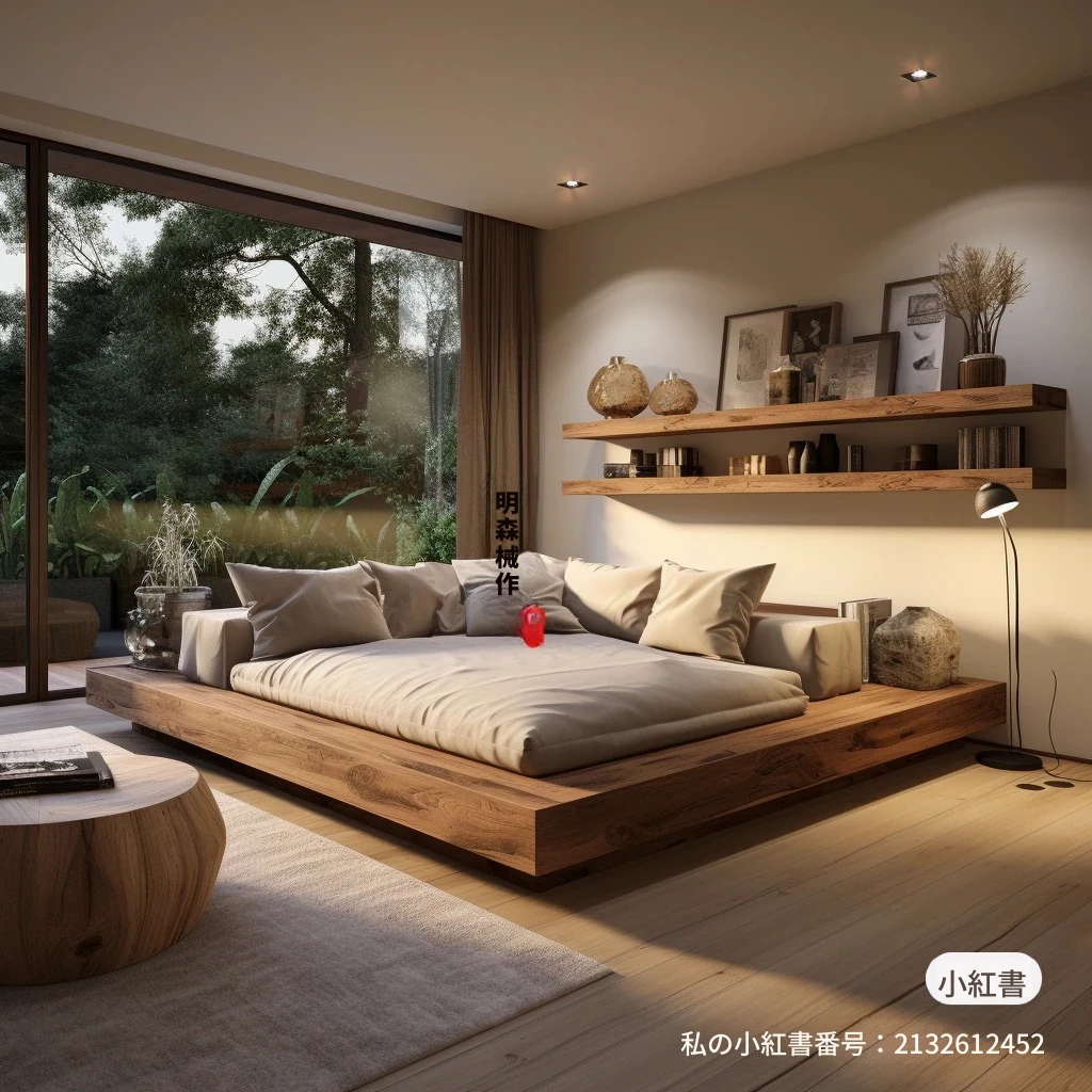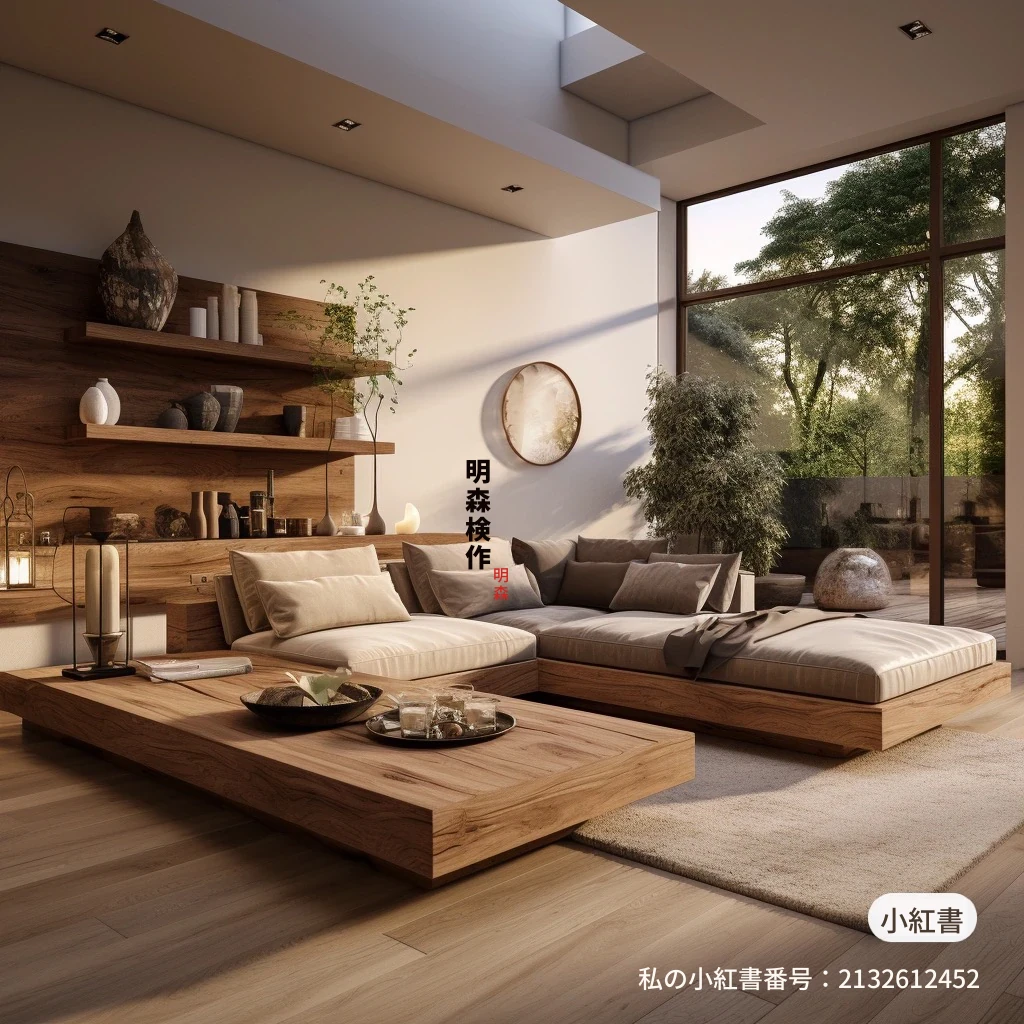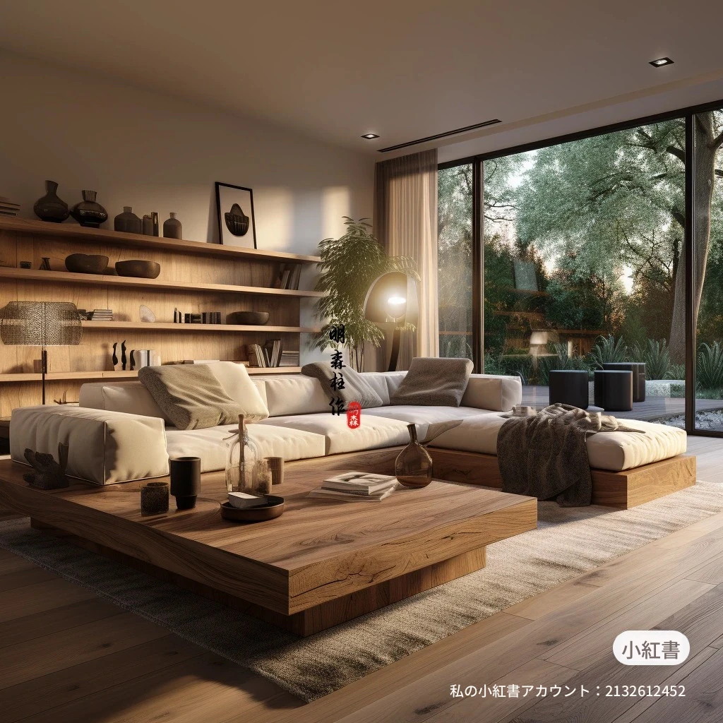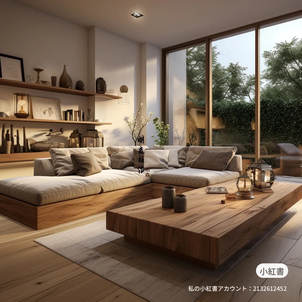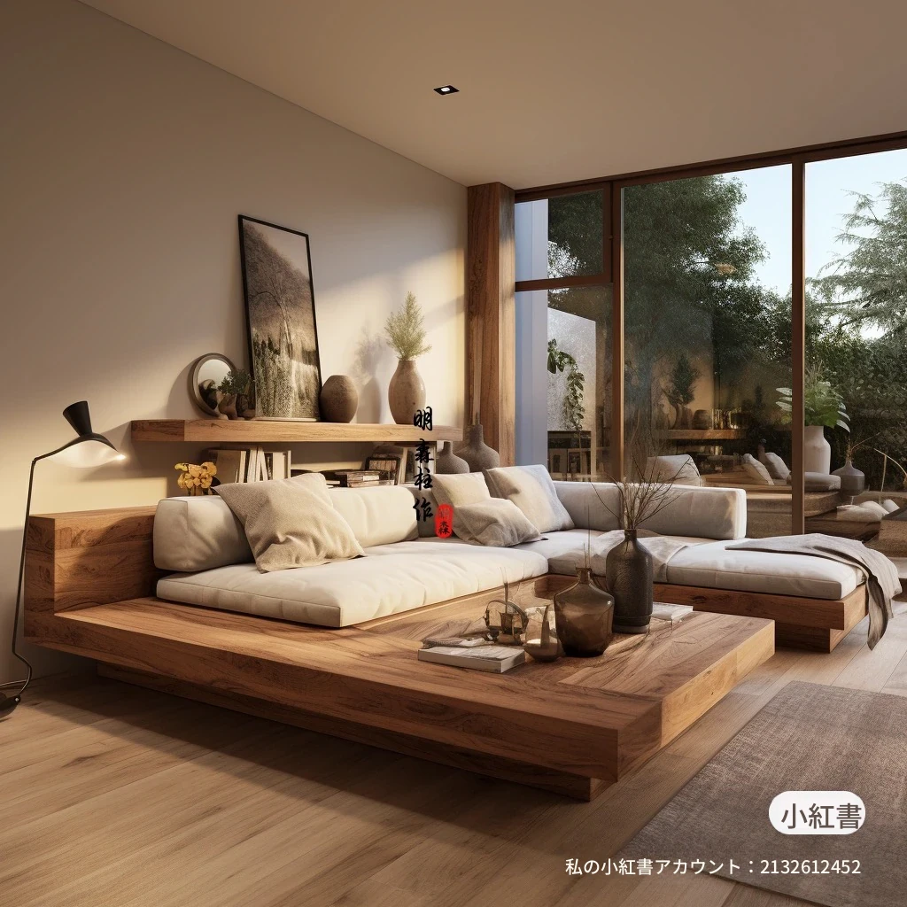 「和の心を感じる!地台ソファ・タタミベッド・無垢材家具が揃った癒しの空間を実現するアイテムリスト。侘寂風のコーナーソファチェアで、あなたのリビングを特別な場所に!」