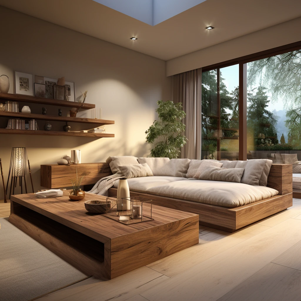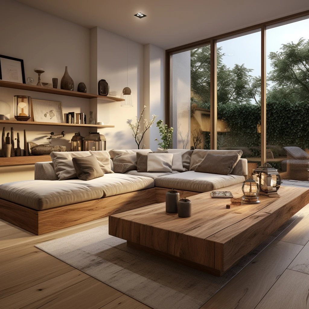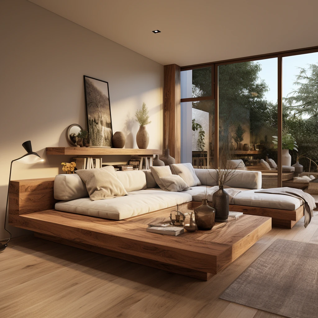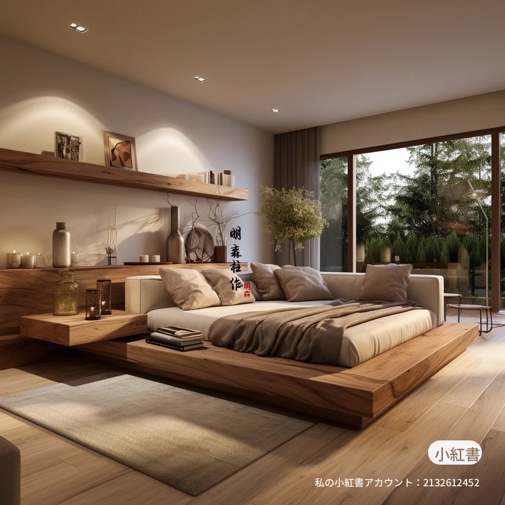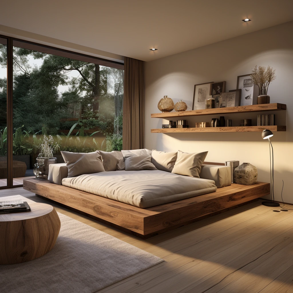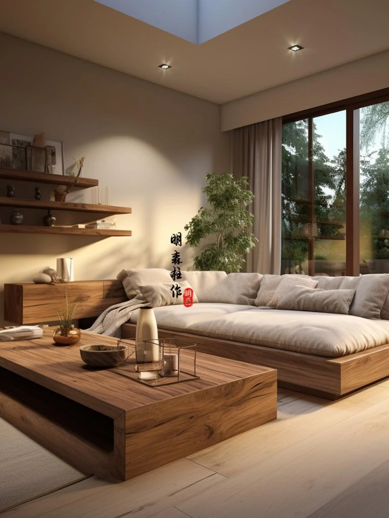 「和の心を感じる!地台ソファ・タタミベッド・無垢材家具が揃った癒しの空間を実現するアイテムリスト。侘寂風のコーナーソファチェアで、あなたのリビングを特別な場所に!」